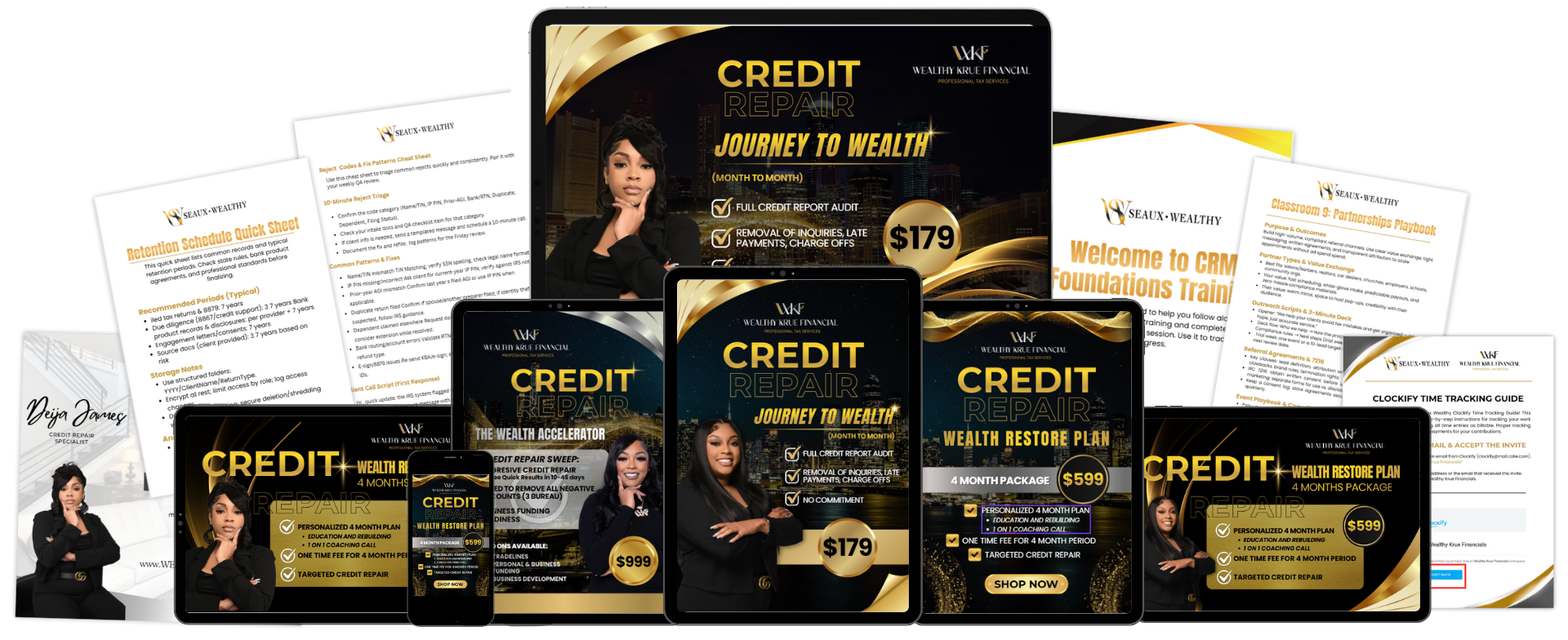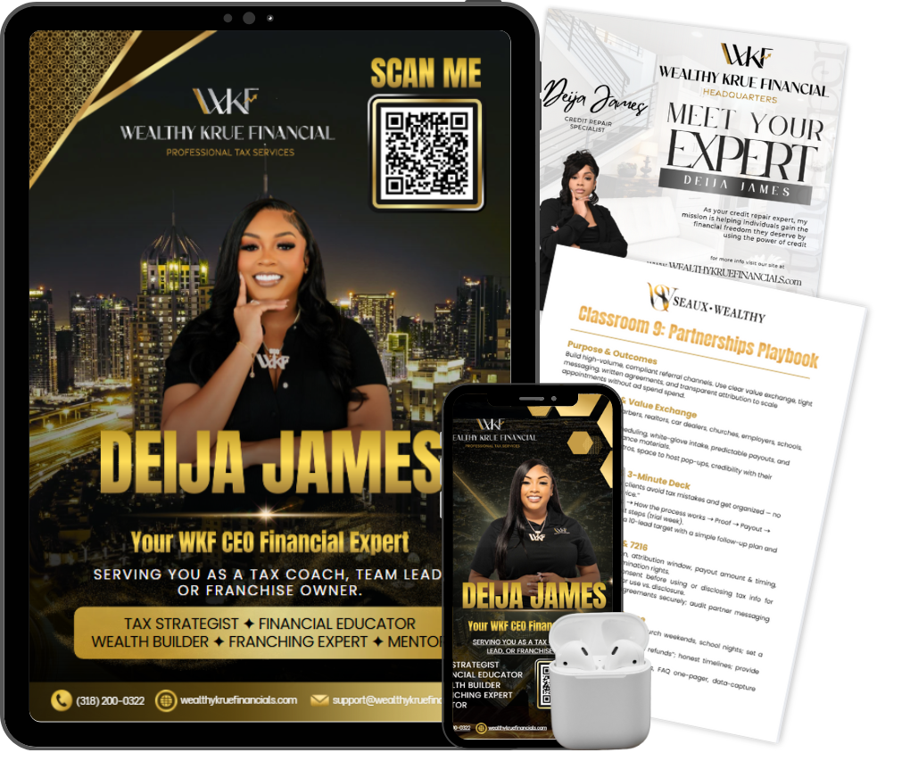 Dr. Deija James, Doctor of Philosophy in Business & Accounting (2025), is the founder and CEO of Wealthy Krue Financials, Seaux Wealthy Enterprise, and Seaux Branded Co.—a powerhouse ecosystem helping tax professionals turn skill into scalable, systemized, and sustainable companies. What began at a single desk has become a multi-million-dollar franchise with 20+ offices nationwide, where Deija has trained 500+ tax professionals and is widely regarded as a leading voice on structure, scale, and automation.