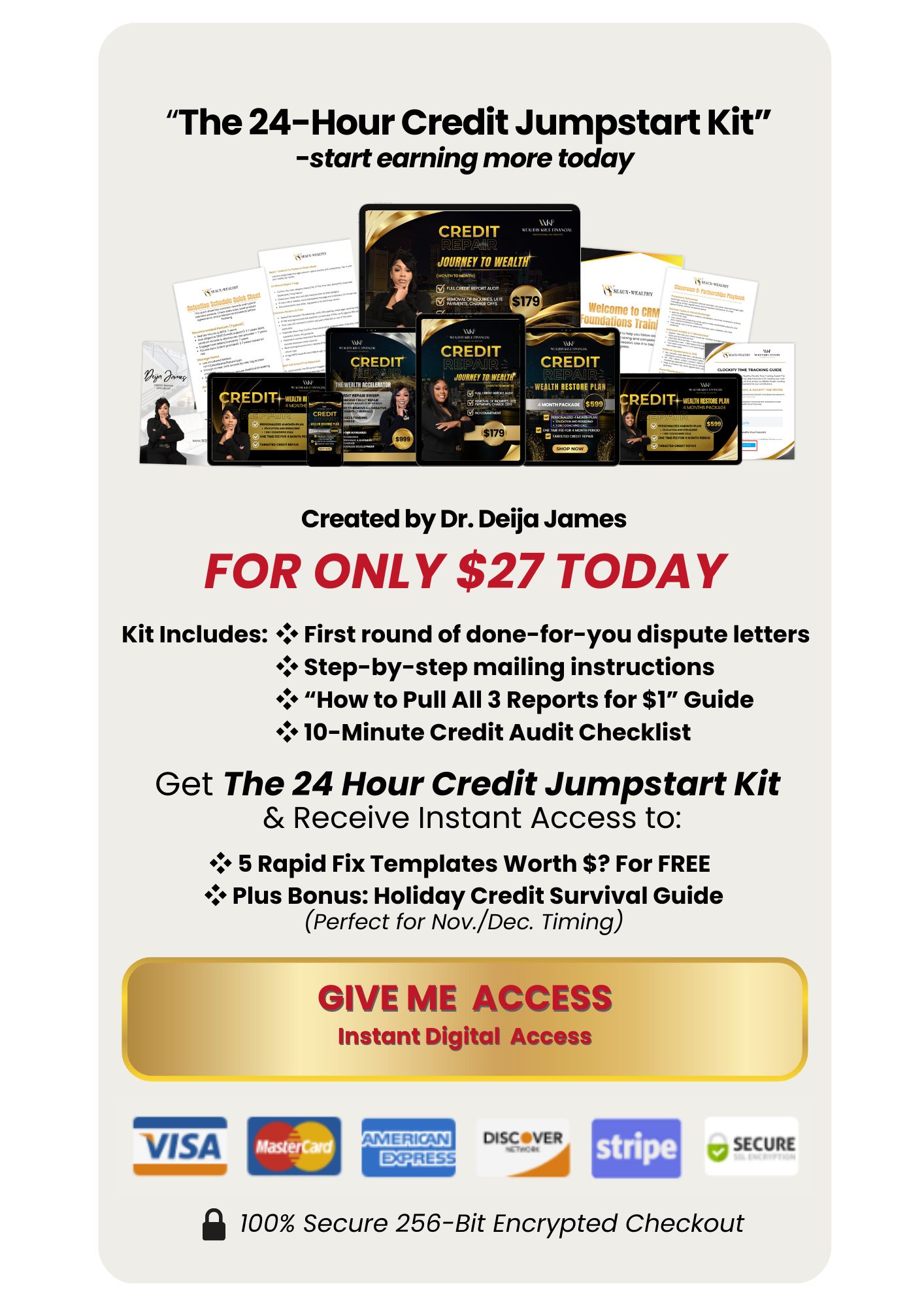 Your credit won’t fix itself. Every day you wait could cost you money and opportunities. For just $27, you can grab your 24-Hour Credit Jumpstart Kit and start repairing your credit TODAY with custom letters, done-for-you templates, and step-by-step instructions.